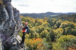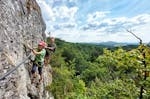Für die Klettersteigtour triffst Du Dich am Wandererparkplatz in Hirschbach. Dort erhältst Du Klettergurt, das Klettersteigset und einen Helm. Nach einem rund halbstündigen Aufstieg erreicht Ihr den Einstieg des Höhenglücksteigs, wo Dir die Guides eine fundierte Einweisung in die Handhabung der Ausrüstung geben. An einem kurzen Übungsstück kannst Du Dich mit der Ausrüstung vertraut machen.