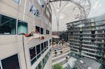 • Blick auf den DB Tower und die ikonische Dachkonstruktion