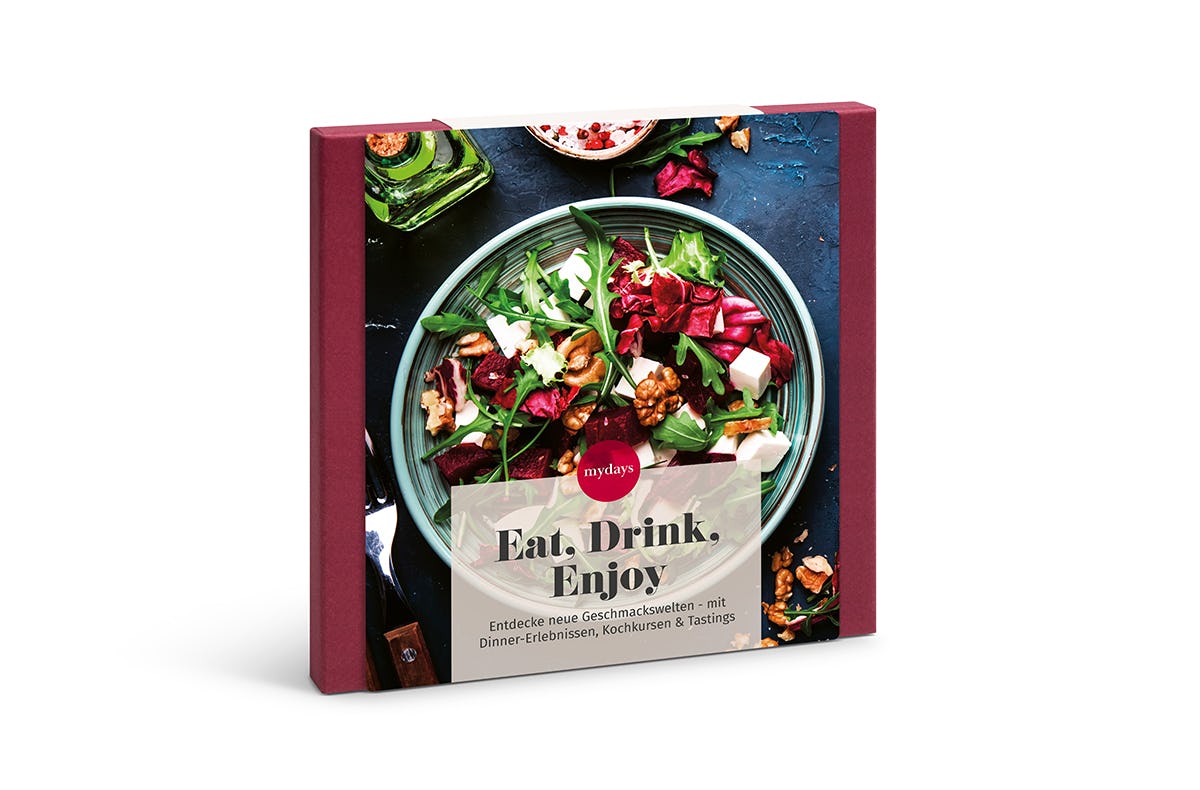 Das perfekte Geschenk für Genießer: Die Geschenkbox Eat, Drink, Enjoy steckt voller Gaumenfreuden für jeden Geschmack. Auf Kulinarikwolke 7 schweben beim romantischen Candle-Light-Dinner für 2, beim Weinseminar oder beim mediterranen Kochkurs. Mmmh, so lecker...