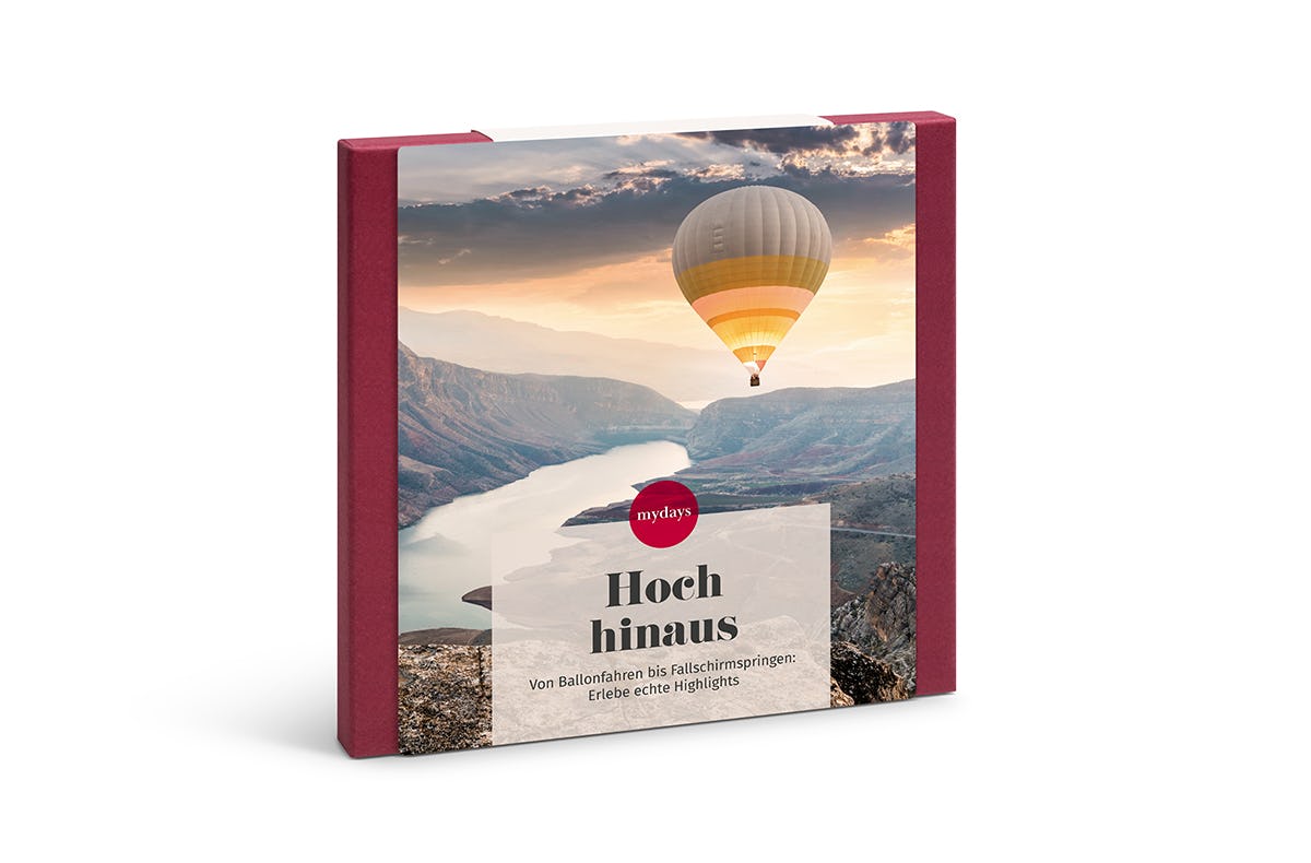 Luftige Erlebnisse bei ungetrübter Aussicht: Das verspricht die Geschenkbox Hoch hinaus! Ob eine Fahrt im Heißluftballon, ein Fallschirmsprung aus einem fliegenden Flugzeug oder ein Rundflug mit einem Hubschrauber - das Motto ist hoch. Auf 1000 Metern fühlt sich jeder Abenteurer grenzenlos frei. Ein Erlebnis mit Langzeitwirkung. Die Euphorie bleibt.