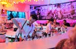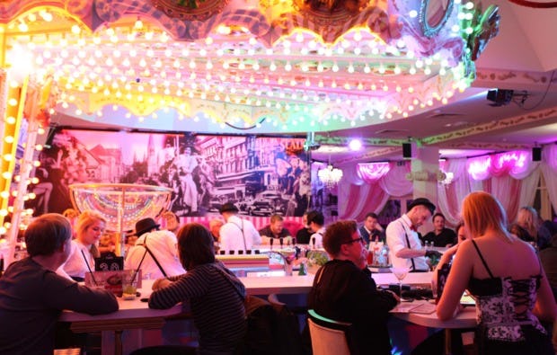Nur wenige hundert Meter vom Alexanderplatz entfernt scheinen quietsch-bunte Lichter in den grellsten Farben. Das ist die Wilde Matilde! Sobald Ihr den Fuß in die Tür gesetzt habt, kommt das Gefühl in Euch auf, Ihr hättet das Wunderland betreten. Knallige Bonbonfarben und eine Einrichtung im Stil der 20er Jahre verzaubern Euch vom ersten Moment an. Ein besonderes Highlight: Die Bar in Kettenkarussell-Design. Hier werden jeden Abend köstliche Cocktails gemixt und der Tresen zur Showbühne. Der perfekte Ort für eine fantastische Varieté Show in Berlin. In den nächsten vier Stunden wird hier die Nacht zum Tag gemacht und ein Programm der besonderen Art präsentiert.