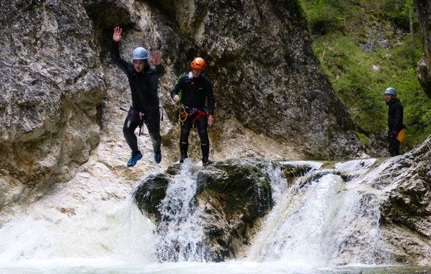 Dein Ehrgeiz ist geweckt? Bevor das Canyoning am Traunsee startet, bekommst Du selbstverständlich von einem erfahrenen Guide eine umfassende Einweisung in die Ausrüstung und die Techniken beim Canyoning in Gmunden. Bist Du dann mit Neoprenanzug, Klettergurt und -helm ausgestattet, kann das Canyoning am Traunsee endlich beginnen. Nach einer etwa einstündigen Wanderung erreichst Du gemeinsam mit Deinen Mitstreitern die erste Wassergumpe, eine Vertiefung im Flussbett. Von hier aus bewegt Ihr Euch nun je nach Beschaffenheit der Landschaft kletternd, springend rutschend oder auch mal tauchend vorwärts. Unterwegs genießt Ihr den Blick auf tosende Wasserfälle und majestätische Felsen, rutscht von ganz oben direkt in das erfrischende Nass oder seilt Euch, wenn der Sprung doch einmal zu weit erscheint, einfach ab. Solltest Du Dich beim Canyoning in Gmunden zwischendurch etwas unsicher fühlen oder einmal nicht weiterwissen, steht Dir der Profi natürlich immer zur Seite.