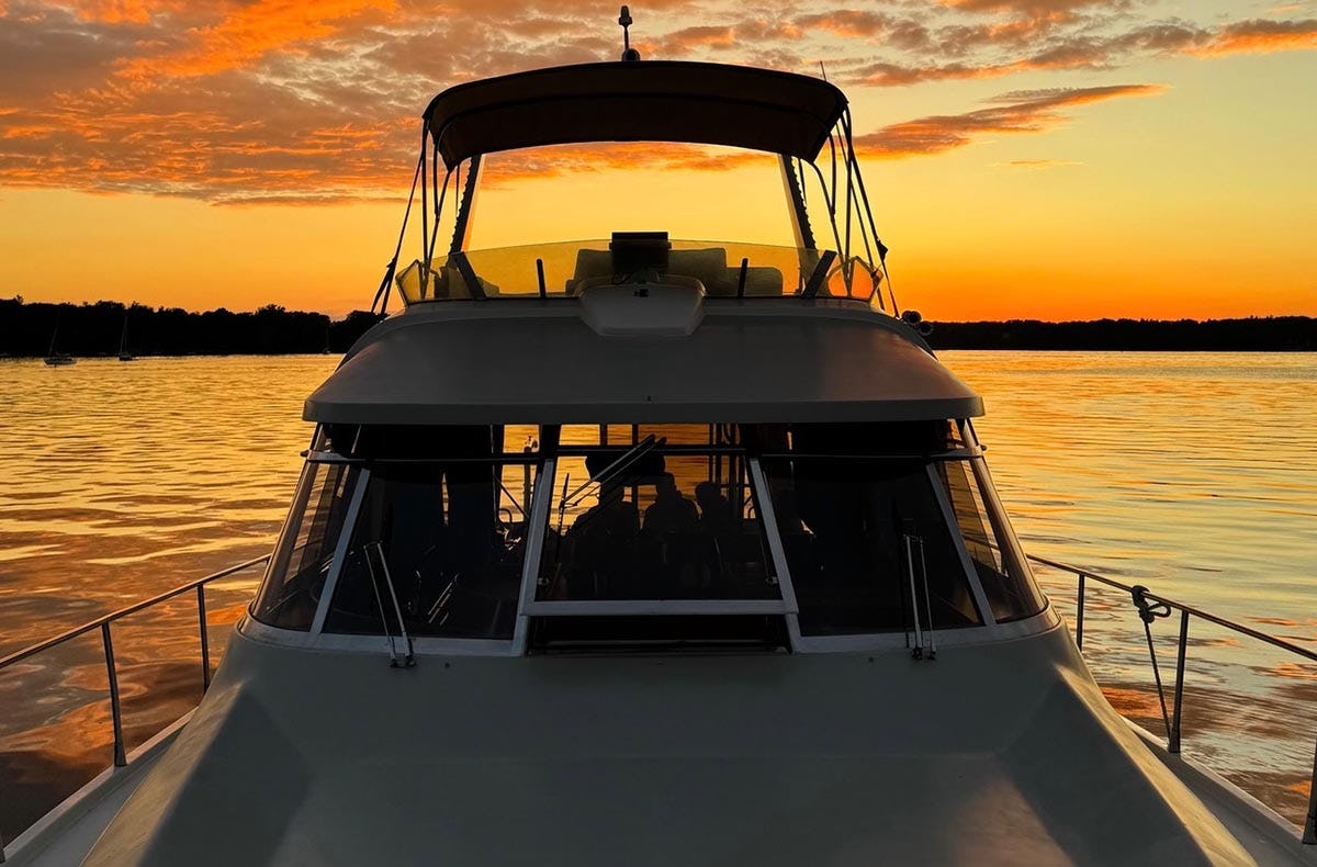 Wenn warme Sonnenstrahlen langsam über den Wannsee gleiten und das Wasser in weichem Gold schimmert, beginnt Deine Sunset Yachttour Berlin – eine stille Reise durch die Sieben Seen auf einer eleganten italienischen Luxusyacht vom Typ Riva 50 Superamerica. Vorbei an der Pfaueninsel, Schloss Cecilienhof und der geschichtsträchtigen Glienicker Brücke eröffnet sich Dir eine neue Perspektive auf Berlin – sanft, stilvoll und fern vom Trubel. Auf dem beheizten Achterdeck oder der Flybridge genießt Du die Abendstimmung in intimer Atmosphäre. Während die Dämmerung langsam einzieht, entsteht auf dem Wasser eine besondere Form von Ruhe und Nähe. Nutze diese besondere Zeit: Lass Dir diesen Moment nicht entgehen.